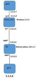 Hi all, My name is Tamar and I have the release 5.0.1 of the FRRouting, it is an excellent IP routing protocol suite! I try to use frr in multicast traffic. 1) Is frr support multicast traffic? (I ask because I tried without success) I write this commands: ip multicast ip pim rp IP ADDR inteface INTERFACE ip pim sm\\ in all interfaces Also I add an ospf: router ospf 1 network 0.0.0.0 0.0.0.0 area 0 my setup include tow PC and one additional router (VM of cisco) [cid:image004.jpg@01D46B90.20365000] This setup does not foreword a multicast traffic unfortunately ... 2) I try to debug the traffic in the frr with the "debug" commands but it does not print to the screen anything. In the manual [cid:image006.jpg@01D46B90.20365000] When I wrote the command I got [cid:image007.png@01D46B8F.489CADB0] Why? 3) Is the frr support pim protocol? It is written in the manual but not work in my setup I would be very grateful if you could help me with this. Thank you! Tamar [cid:image002.jpg@01D26F1D.BF96EE00] Tamar Cohen NFV SW Engineer T: +972-73-270-7625 F: +972-08-6436791 | tamar_c@rad.com<mailto:tamar_c@rad.com> www.rad.com<http://www.rad.com/> | Follow RAD on LinkedIn<http://www.linkedin.com/company/7369/> | Facebook<http://www.facebook.com/pages/RAD-Data-Communications/72479223117> | Twitter<http://twitter.com/raddatacomms> | YouTube<http://www.youtube.com/user/radwebmaster#g/u>