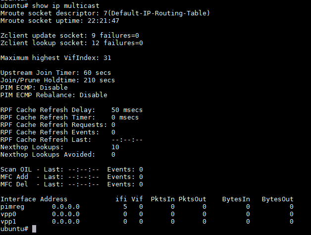The `show ip multicast` command is showing that pim does not think vpp0 or vpp1 have an ip address or an associated VIFI in the linux kernel. I would recommend trying this again: conf t interface vpp0 no ip pim sm ip pim sm ! interface vpp1 no ip igmp join 224.1.1.1 3.3.3.4 no ip pim sm ip pim sm ip igmp join 224.1.1.1 3.3.3.4 ! Then let's re-issue a `show ip multicast` and see if those interfaces are now configured under pim. If not we can discuss debugging. I would also recommend joining the FRRouting slack for a real-time debugging ability. donald On Wed, Oct 24, 2018 at 8:17 AM Tamar Cohen <tamar_c@rad.com> wrote:
