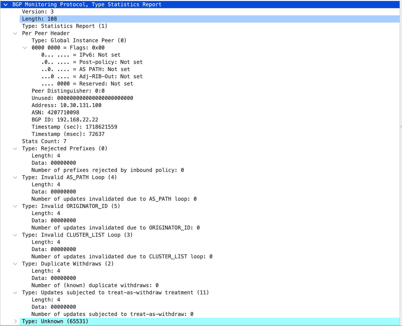 Hi all, During the testing I found strange BMP issue. RFC 7854 describes several types of BMP messages, one of them is Stats Report (https://www.rfc-editor.org/rfc/rfc7854#page-13). The FRR documentation (.https://docs.frrouting.org/en/latest/bmp.html#bmp-session-configuration ) explicitly says:" - the following statistics codes are implemented: - 0: count of prefixes rejected - 2: count of duplicate prefix withdrawals - 3: count of prefixes with loop in cluster id - 4: count of prefixes with loop in AS-path - 5: count of prefixes with loop in originator - 7: count of routes in adj-rib-in - 8: count of routes in Loc-RIB - 11: count of updates subjected to RFC 7607 “treat as withdrawal” handling due to errors - 65531: experimental count of prefixes rejected due to invalid next-hop Note that stat items 3, 4 and 5 are specified to count updates, but FRR implements them as prefix-based counters. "The issue is that I do not see Stats Types 7 and 8 in the BMP message from FRR towards BMP collector (goBMP in my test setup): There are only 7 statistic types and no statistic codes 7 and 8. Is this a bug or I missed something in BMP config ? Here is the BMP config oof the FRR for the reference: bmp targets ubuntu-BMP bmp stats interval 300 bmp monitor ipv4 unicast pre-policy bmp monitor ipv4 unicast loc-rib bmp connect 10.30.131.101 port 5050 min-retry 30000 max-retry 3000 source-interface eth2 exit FRR1# sh ver FRRouting 10.0_git (FRR1) on Linux(5.15.0-102-generic). Thank you in advance for the clarification. SY,Boris