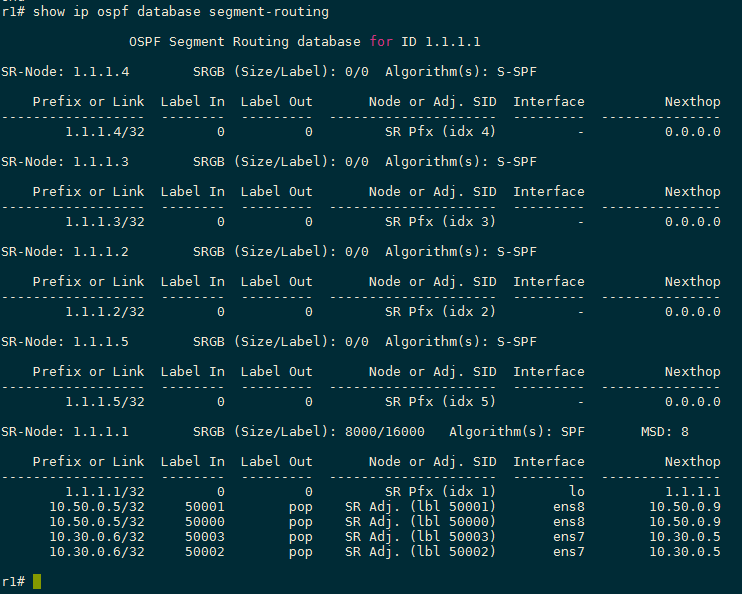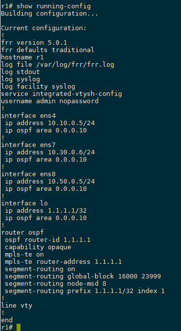 Hello, My name is Zhijun. I am learning segment routing by using FRRouting. First, thank you for writing such a guide to setup segment routing in FRRouting. I have read this guide and set up an sr environment with 5 FRR routers. However, I cannot make it sure whether I did correctly. Bellow is my topo. [image: image.png] and this is my r1 config, [image: image.png] and I got bellow sr info, [image: image.png] I would be very grateful if you can tell me if this is right to config such an sr environment. And, in depth, how can I config a label switch path for traffic between H1 and H2, such as icmp packets? Best Reguards, Zhijun