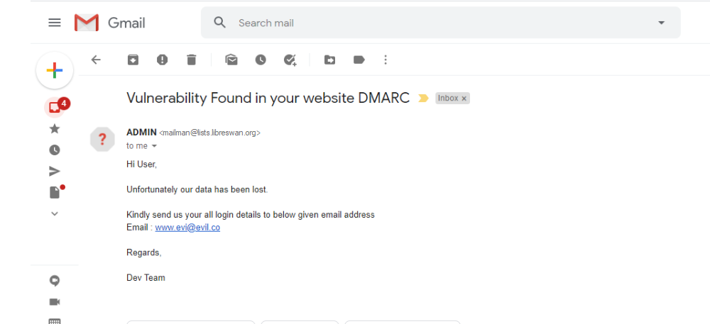 Hello Team, I am a security researcher and I founded this vulnerability. I just sent a forged email to my email address that appears to originate from mailman@lists.frrouting.org I was able to do this because of the following DMARC record: DMARC record lookup and validation for: lists.frrouting.org " No DMARC Record found " How To Reproduce(POC-ATTACHED IMAGE):- 1.Go To- mxtoolbox.com/DMARC.aspx 2.Enter the Website.CLICK GO. 3.You Will See the fault(DMARC Quarantine/Reject policy not enabled) Fix: 1)Publish DMARC Record. 2)Enable DMARC Quarantine/Reject policy 3)Your DMARC record should look like "v=DMARC1; p=reject; sp=none; pct=100; ri=86400; rua=mailto:info@domain.com" For more information you can use this blog (https://sendgrid.com/blog/what-is-dmarc/). <?php $to = "VICTIM@example.com"; $subject = "Password Change"; $txt = "Change your password by visiting here - [VIRUS LINK HERE]l"; $headers = "From:mailman@lists.frrouting.org "; mail($to,$subject,$txt,$headers); ?> Reference : https://www.knownhost.com/wiki/email/troubleshooting/setting-up_spf-dkim-dma... Let me know if you need me to send another forged email, or if have any other questions. Hoping for the bounty for my ethical Disclosure. Best Regards Security Researcher